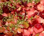 Филе селедки, ананас и свеклу режем мелкими кубиками, добавляем к сельдерею.