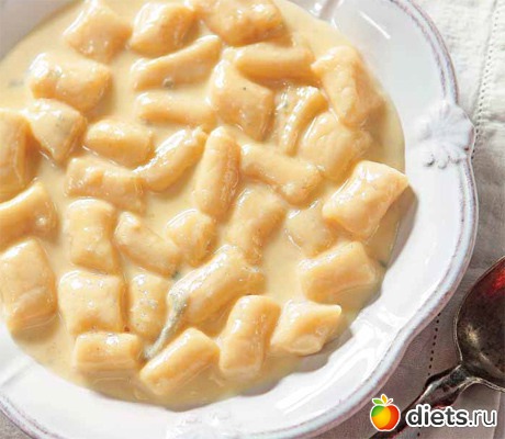 7. В слегка подсоленной воде отварить ньокки и, как только они всплывут, вынуть из воды и опустить в сырный соус. Посыпать пармезаном и измельченными орехами.