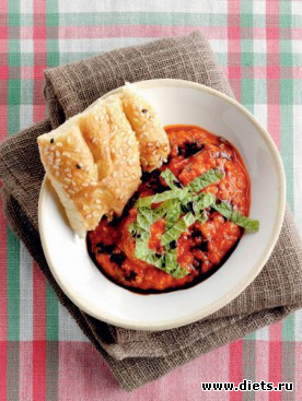 Снимите с перцев почерневшую кожуру, разрежьте их. Удалите семечки. Соберите сок, который при этом вытечет. Добавьте в стакан блендера и взбивайте до получения крема. Уберите в холодильник на 1 час. Затем полейте оставшейся частью гранатового сока и посыпьте мелко нарезанными листиками мяты. Подавайте с бараниной или мясом курицы.