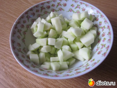 Затем очищаем одно сладкое яблоко, вырезаем сердцевину и мелко нарезаем. Выкладываем на отдельную тарелку и поливаем лимонным соком. Должно постоять несколько минут чтобы яблочко стало беленьким.