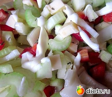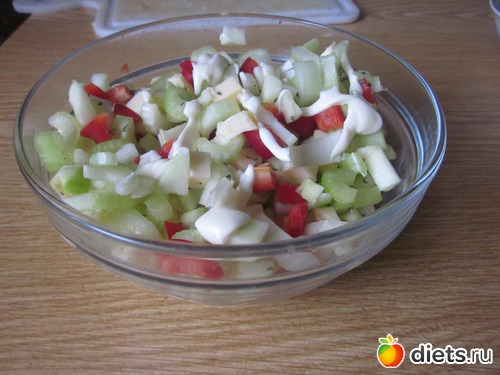 Немного посолить, слегка заправить низкокаллорийным майонезом и салатик готов, обычно приготовение не занимает больше 7-10 минут