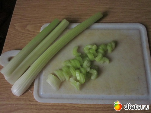 Для начала нарезаем сельдерей, желательно потоньше