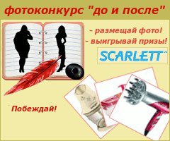 Худеем и фотографируемся! В первом месяце 2012 года мы продолжаем добрую традицию пополнения нашей галереи "до и после" с фотографиями вашего похудения. Раздел этот, по праву, можно назвать лучшим мотиватором для похудения нашего сайта, а то и (к чему скромничать в теплой компании) всего рунета. И, конечно же, бессменный спонсор конкурса, марка Scarlett поможет нам в награждении наших героев!