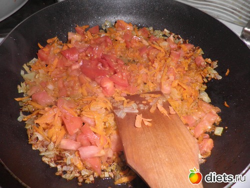 на раст. масле мелко порезанный репчатый лук, морковь, тёртую на тёрке, помидор, нарезанный на кубики,