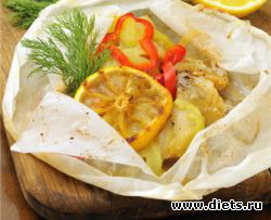 4. Накройте рыбу с овощами оставшимися кружками пергамента. Плотно заверните края «косичкой». Переложите получившиеся конструкции на противень и готовьте в разогретой до 190 °С духовке 12–15 мин. Затем переложите на тарелки и подайте прямо в пергаменте, сделав посередине небольшой крестообразный разрез ножницами, чтобы вышел горячий пар.