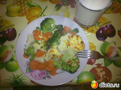 ChristinaS купила замороженные овощи. Обожаю брокколи и цветную капустку. Добавила морковочки, подлила водички и в духовку. Потом немного сыра сверху насыпала. запила кефирчиком.
