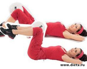 Упражнения для живота. Можно выполнять обычные подъемы туловища от пола из положения лежа в положение сидя. Для тренировки косых мышц живота, руки скрестить за головой и тянуться поочередно правым локтем к левой ноге и наоборот. Интенсивную нагрузку на пресс дает упражнение «Лягушка». Для этого лечь на пол прямо и делать поочередно движения, имитирующее прыгание лягушки: раз - приподнимаем туловище и тянемся руками вперед, а прямыми ногами в противоположную сторону, два - возвращаем торс и ноги сгибая коленях. Упражнение повторить 20 раз. Такое упражнение дает интенсивную нагрузку на верхние и нижние мышцы живота.