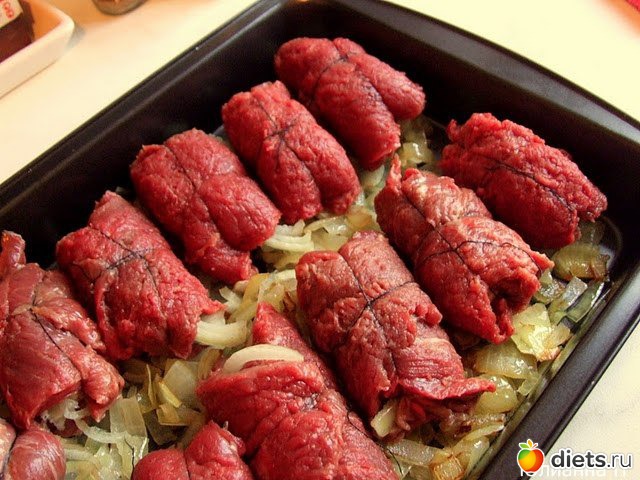 Мясо (говядина) нарезать тонкими широкими ломтиками, отбить их, посолить, посыпать перцем. Уложить на них ломтик шпика, кружочки репчатого лука (в идеале ещё и ломтик солёного очищенного от кожицы огурца)