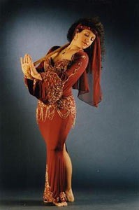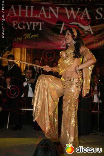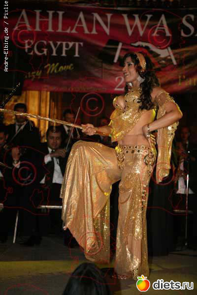 Часто девушки танцуют в однотонном, обычно белом платье из трикотажа украшенным золотом-серебром и с глубоким вырезом спереди, в который виден золотой лиф. На бедрах - пояс с монистами.