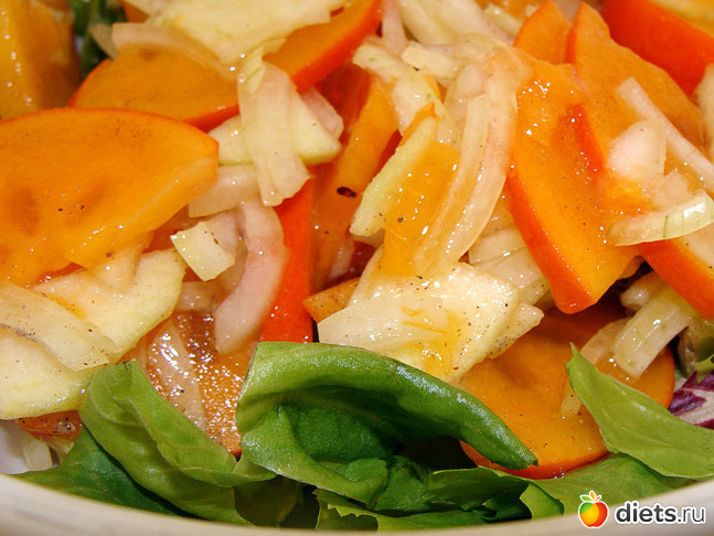 В другой чашке смешиваем хурму, лук, яблоко и заливку. Хорошо перчим. Перемешиваем.