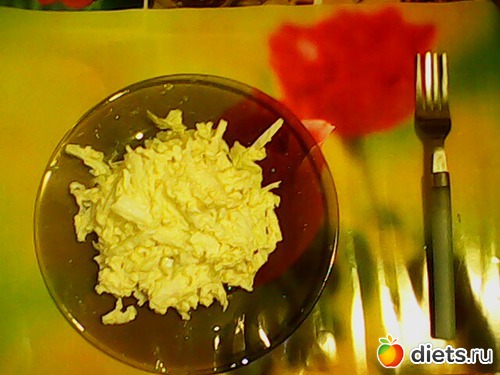 это салат из пекинской капусты, яйца, порезанного блендером и немного сметанки, ну и капелька соли. Очень люблю этот салат, свежо и полезно.