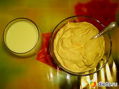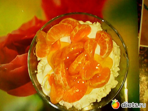 творог 170 грамм + 1,5 мандарики + 70 грамм сметанки + 10 грамм меда делаем пюре с помощью блендера - очень вкусно. Вот конечный итог