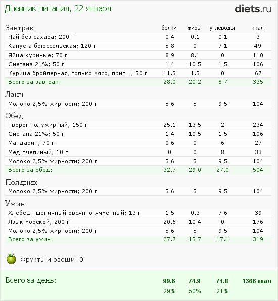 Вот табличка - опять жиров многовато, и при очень белковом на мой взгляд питании белка все равно очень и очень мало