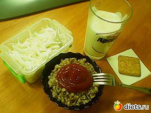Тут довольно плотненько, ну относительно конечно. Это салат из брюссельской капусты со сметанкой, немножко подсолила, гречневая кашка с чуточкой томатного соуса, в стаканчике кефирчик и одна печенюшка. Раз в неделю можно