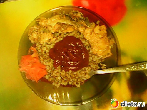 Рыбка, кашка гречневая с соусом и немножко имбиря