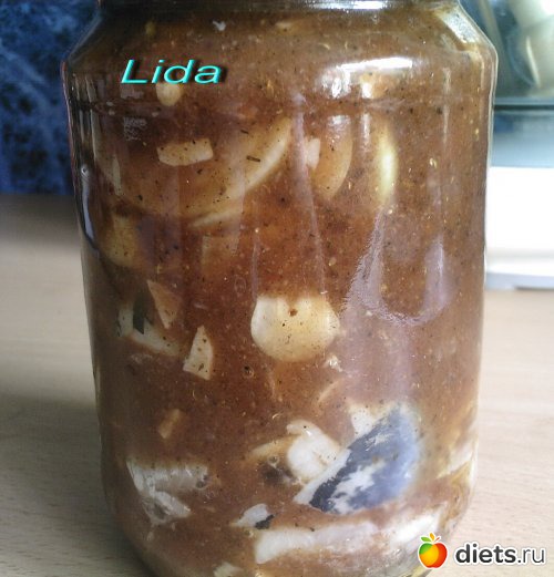 В банку ложим на дно лук, селедку слоями. Залить соусом. Поставить в холодильник. Сутки подождем.