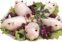 Тушки кальмаров очистите, отварите 3-4 мин в подсоленной воде, снимите пленку и дайте кальмарам остыть. Затем отрежьте боковые плавники, и с острого конца плавников ножом отрежьте по треугольному кусочку — это будут ушки поросят.