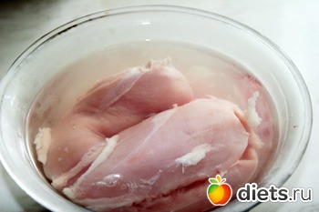 Грудку отделить от костей, но оставить целой. Положить в соляной раствор (на 1 л воды 2 ст. л. соли) на 2 часа (я оставляла на ночь).