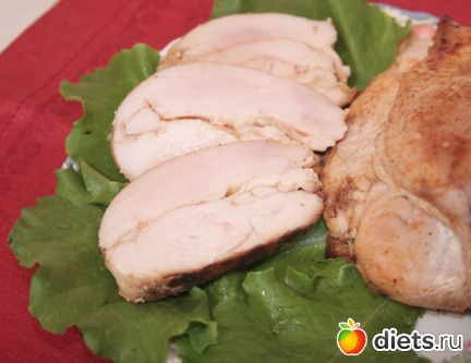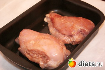 Смешать все специи (рецепт хорош тем, что меняя специи, каждый раз можно получать мясо с новым вкусом). Обмазать хорошо грудку пряной смесью, выложить на противень. ( Лучше застелить его фольгой, чтобы потом не мыть)
