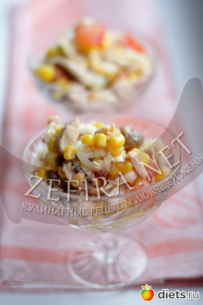 Помидоры и кукурузу (без жидкости) выложить в салат.