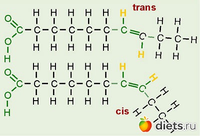 Если мы возьмем цепочку ненасыщенной полезной жирной кислоты и в месте двойной связи условно перекрутим его вокруг своей оси, то получится так называемая трансконфигурация этого жира.