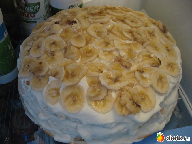 Выложить в форму слоями: кубики бисквита, бананы, так, чтобы получилось по 2 слоя. залить все кремом и поставить в холодильник на 2 часа. если форма разборная, выложить дно и борта цельным куском бумаги для выпекания, чтобы крем не вытек.