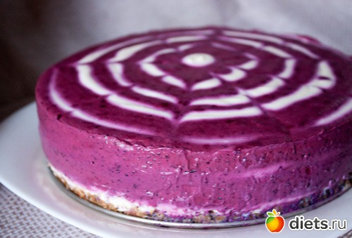 Готовится торт предельно просто - времени на манипуляции с основой и начинкой уходит чуть больше получаса. Все ингредиенты вполне доступны - кроме, разве что, черники - но ее можно купить в замороженном виде. Правда, он не совсем диетический, но можно оставить для исключительных случаев.