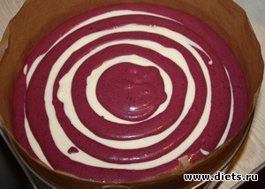 Достаем форму из холодильника и выкладываем вдоль бортика кольцо из пергамента. Начинаем выкладывать начинку по принципу пирога “Зебра” - поочередно по несколько ложек то белой, то синей начинки.