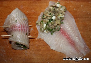 Солим. На каждый пласт кладем немного начинки, заворачиваем в рулетик и закалываем зубочистками.