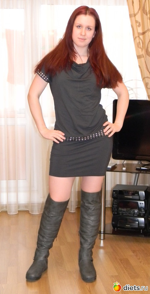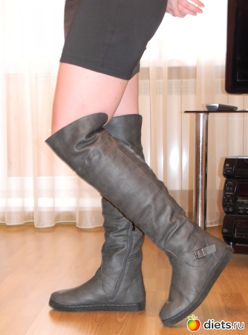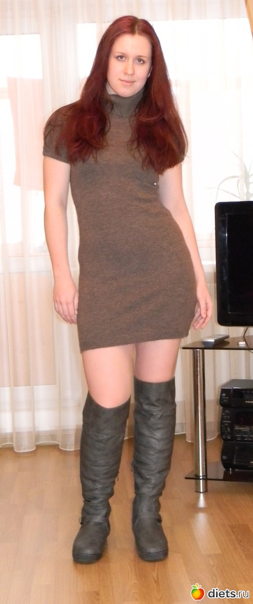 сама люблю высокие сапоги, но я привычная к подошве у которой каблук все-таки выделен (даже если он 1 см высотой), но если не обращать на нее внимания, то мне очень нравится сочетание высокие сапоги и платье