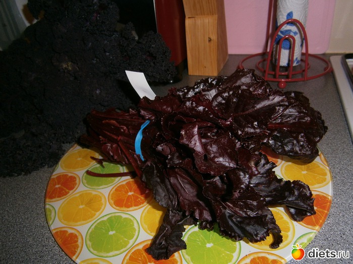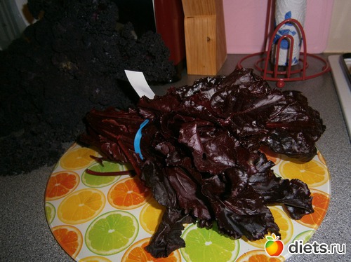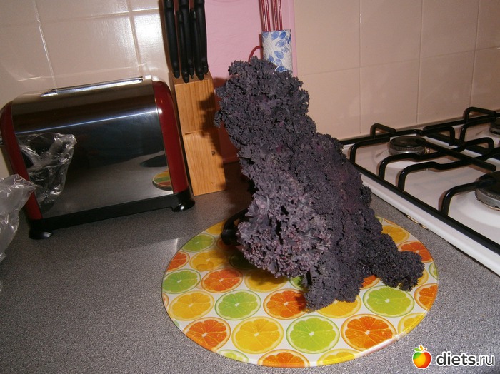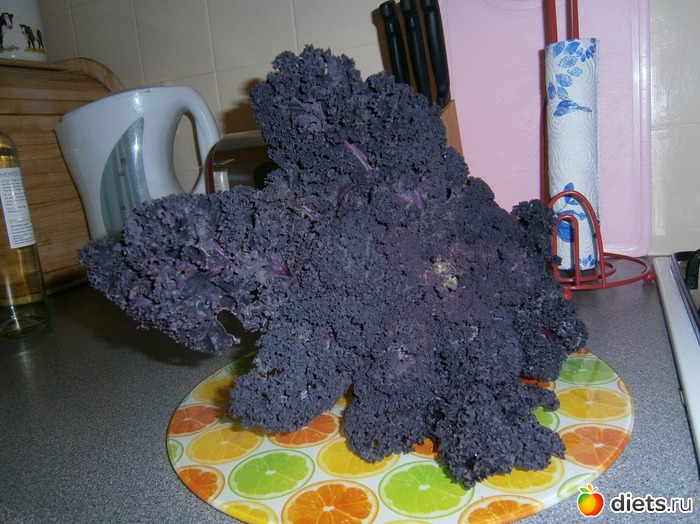 Тут на днях муж отвез меня в новый супермаркет. Мне казалось, что в области зеленых съедобных листьев я уже знаток и, в основном, все попробовала. Не тут то было! В этом новом супермаркете оказался просто потрясающий отдел овощей и фруктов!!! Многое стало для меня открытием. Вот, например, прикупила себе такой салат(или капусту?). Называется - Red Kale