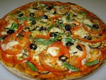 Выложить шампиньоны с цукини и маслины, посыпать паприкой, полить