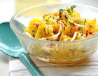 У консервированных ингредиентов слить жидкость. Ананасы нарезать кубиками, лук и зелень измельчить, все смешать с кукурузой... Читать полностью
