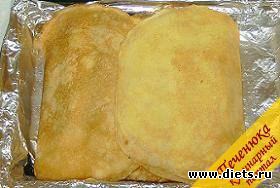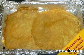 10) Форму для выпекания застелить фольгой, смазать растительным маслом и выложить на дно два блина.