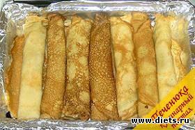 12) Выложить в два слоя трубочки из блинов. Взбить яйцо и залить сверху.
