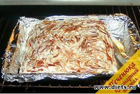 14) Сверху пирог смазать сметаной и кетчупом, поставить в духовку выпекать, при t=180 градусов, на 25 минут.