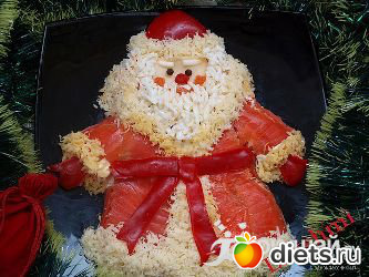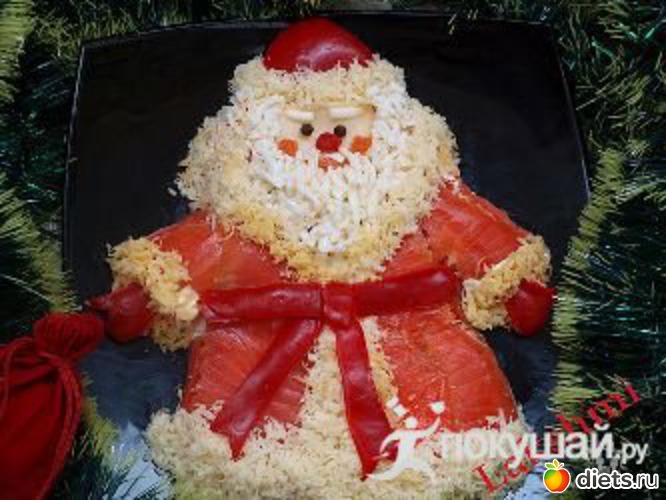 Украсить Деда мороза : Пояс, рукавички, шапочку и мешок сделать из болгарского перца, бороду и волосы из сыра, потертого на терке, лицо из пластинки сыра, щёки из кусочков красной рыбы, нос из красного перца, брови из белка яиц, глаза из горошин перца. Вокруг деда мороза посыпать натертым на мелкой терке варенным яйцом. Украсить зеленым луком на свой вкус!