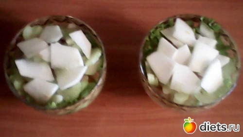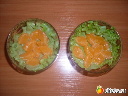 Далее берем креманки и укладываем в нее листья салата и слой мадаринов