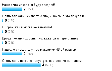 Мне все не нравится. Вобью в голову, что хочу именно что-то определенное (чего в глаза не видела, но мозг нафантазировал, вроде как: "У вас есть такой же, только с перламутровыми пуговицами? Нет?... Будем искать") и потом хожу разочарованная.