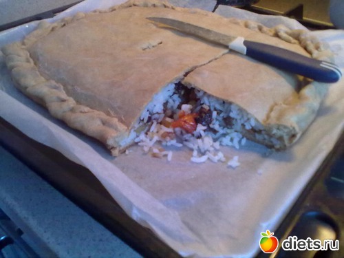 Тесто разделить на 2 части, раскатать, на противень постелить пергаментную бумагу и у часть теста. Выложить слоями рис, изюм, курагу и чернослив и присыпать остатками риса, подсластить если нужно послаще и положить маленькими кусочками сливочное масло, и закрыть второй частью теста. В серединке сделать дырочку и в разогретую духовку на 40-50 минут при температуре 180-200 градусов. Приятного аппетита!!!