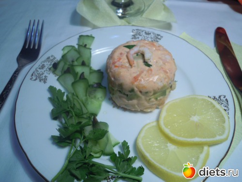 Авокадо чистим, нарезаем кубиками, сбрызгиваем лимонным соком,