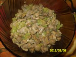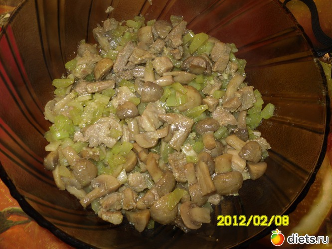 Сельдерей, чайную ложку хмели-сунели (что было дома) и три зубчика чеснока добавила к мясу с грибами