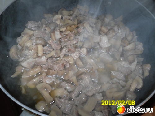 Я взяла 200 грамм свиной шейки, 400 грамм свежих шампиньонов и 50 грамм оливкового масла. Все порезала и потушила в собственном соку минут 40.