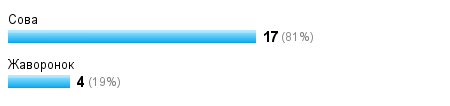 В результате опроса выяснилось, что с понедельника по пятницу жаворонки начинают свой день на 1-1,5 часа раньше, чем совы. В субботу и воскресенье и те и другие отсыпаются, но совы встают уже на 2-2,5 часа позже, чем жаворонки. Собранная информация позволила ученым сделать вывод, что группа рано встающих людей имеет более позитивные показатели общего самочувствия.