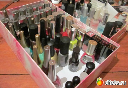 В большой коробке: цветной лак, в маленькой - всяческий уход (базы, лечение), топовые покрытия, магнитные лаки)