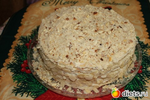 Затем все коржи промазываем кремом (включая верхний и бока) и обсыпаем орехами (в моем случае это миндальная стружка) и крошкой, которая остается после того, как вы подравнивали готовые коржи. Все! Торт готов. Очень важно перед подачей выдержать его не менее 12 часов на холоде.
