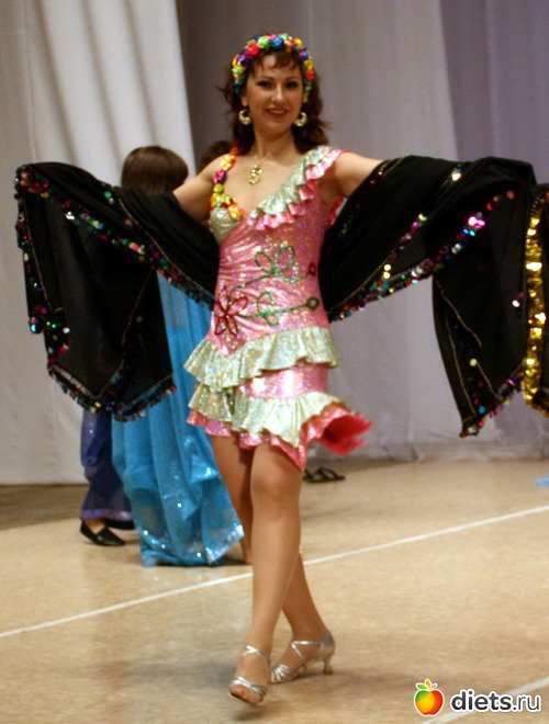Исполняется танец в платье чуть выше колена, с короткими рукавами, с вышивкой и рюшами. Так как для мусульманской культуры Египта такая длина наряда неприемлема, то можно встретить удлиненный вариант платья, скрывающий колени. но то у них, наших же исполнительниц можно сразу узнать по платью длинной по "самое не могу"
