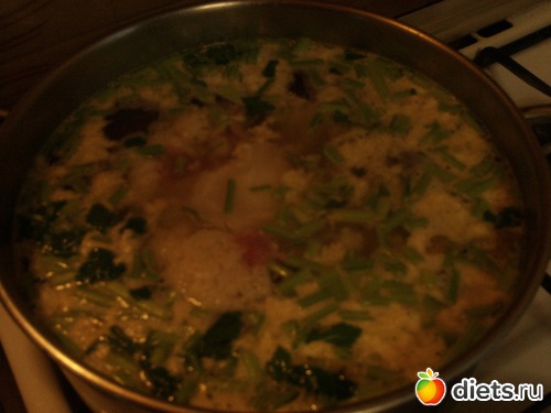 Затем возвращаете в бульон в который добавили зелень при том любую какая у вас есть у меня стебли петрушки которые грубые потому что остальное я добавляю в салаты. И я добавила Йогурт но я бы вам не советовала, он у меня просто свернулся. Если нравиться добавьте томат и перец если любите острое.
