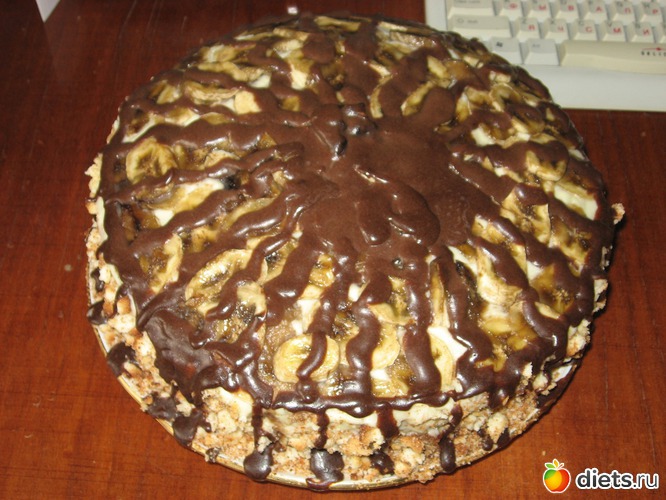 После того как выпечены коржи каждый корж пропитать пропиткой с обоих сторон, помазать кремом и выложить кружочками бананы, и так далее.