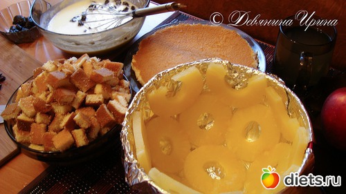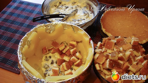там все просто выкладываешь ананасы , залить кремом, слой бананов вдавить в крем , опять бисквит, снова крем и так по очереди !